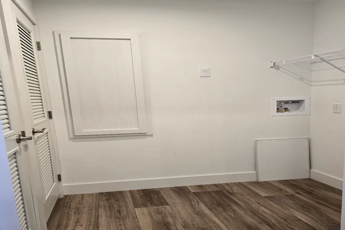 The modern kitchen features a large center island, ample storage and counter space, soft close drawers and you’ll love the modern look of the sleek Samsung stainless steel appliances.